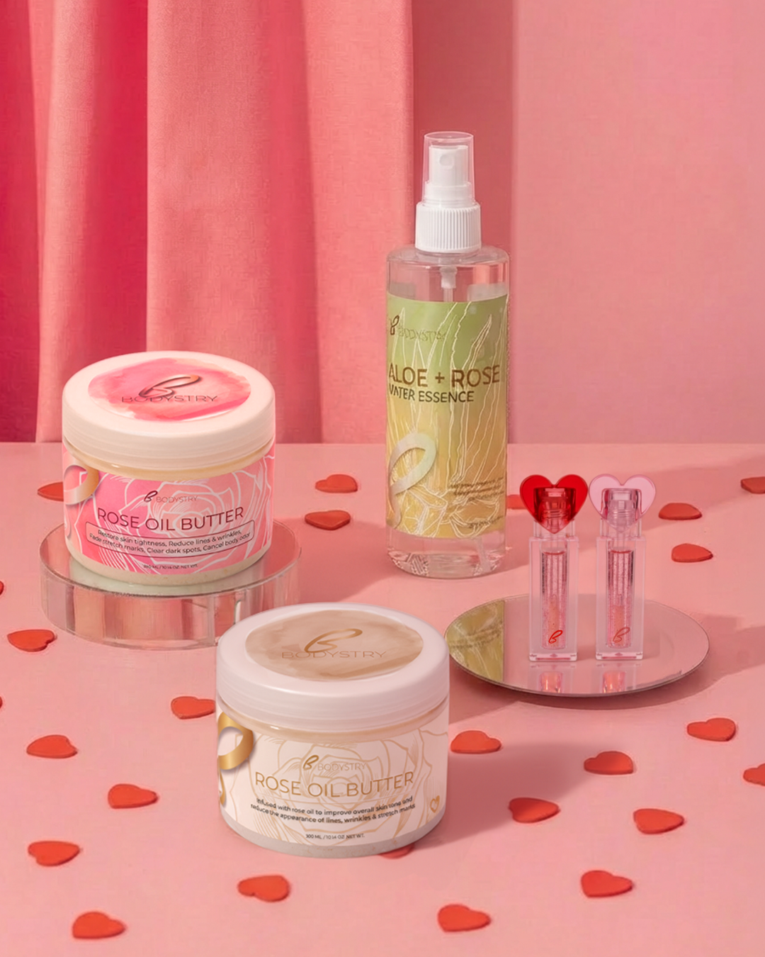 Included: 1 Rose Oil Butter (original or prenatal-friendly formula), 1 Aloe + Rose Water Essence, 1 Love Day Lip Oil